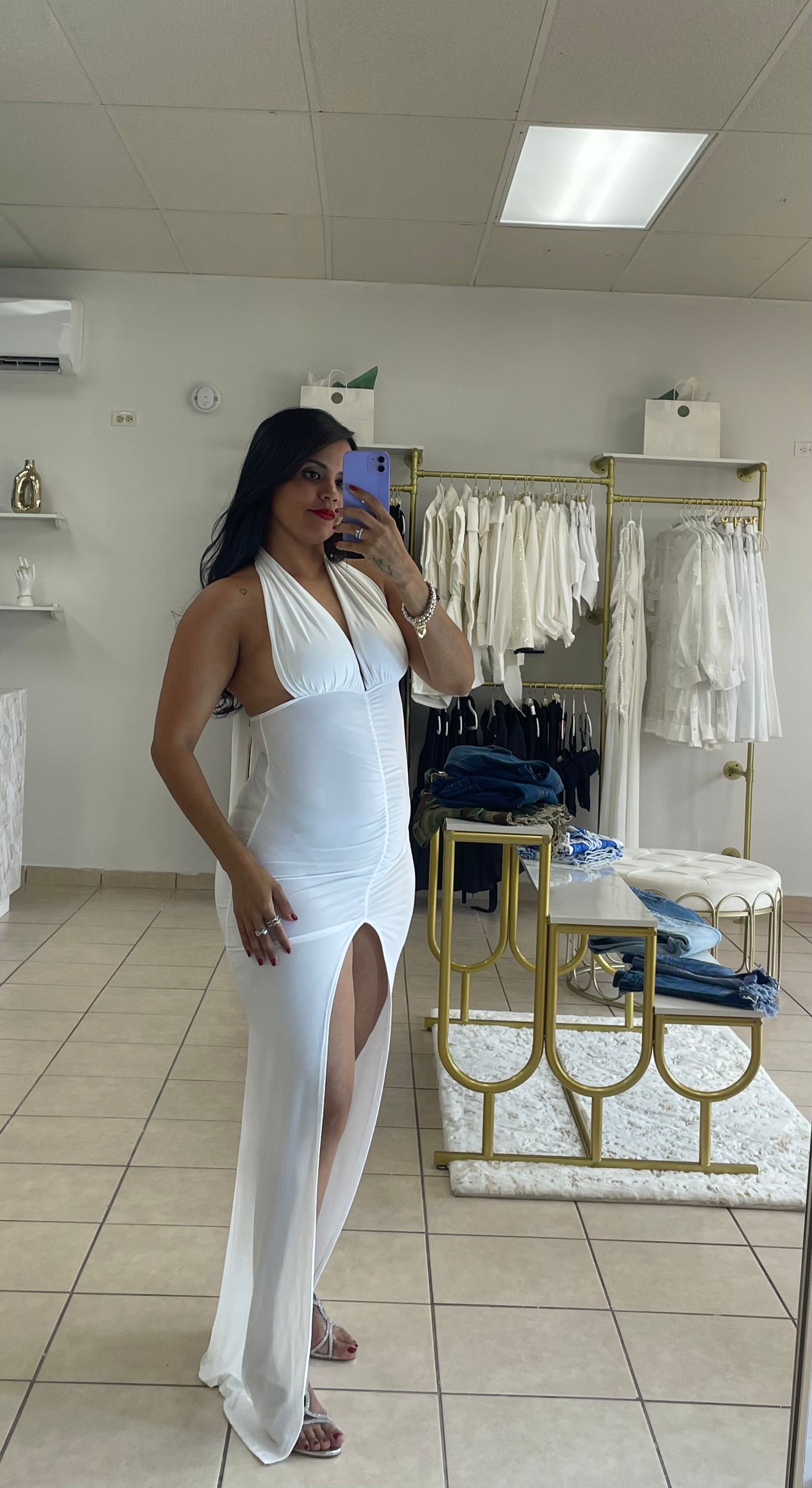 Su diseño incluye escote halter, espalda descubierta y una abertura frontal que aporta un toque sofisticado y femenino sin perder elegancia. La licra permite un fit favorecedor y cómodo, ideal para eventos especiales, cenas o ocasiones formales.